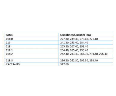 采用IP-585 SIM法,在SCION 436气相色谱上分析了6个关键fame的混合物,并添加了一个内部标准。使用SCION WAXMS色谱柱(50m x 0.20mm x 0.40mm)分离fame。感兴趣的分析物可以在下表中找到。